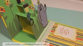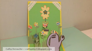 Here is a picture of the inside of the card, trying to show the 2 cuts that make the pop up "shelves". The Inside was decorated with lots of flowers and a watering can, which I got from Cricut's Stretch Your Imagination cartridge. Below is a side view...