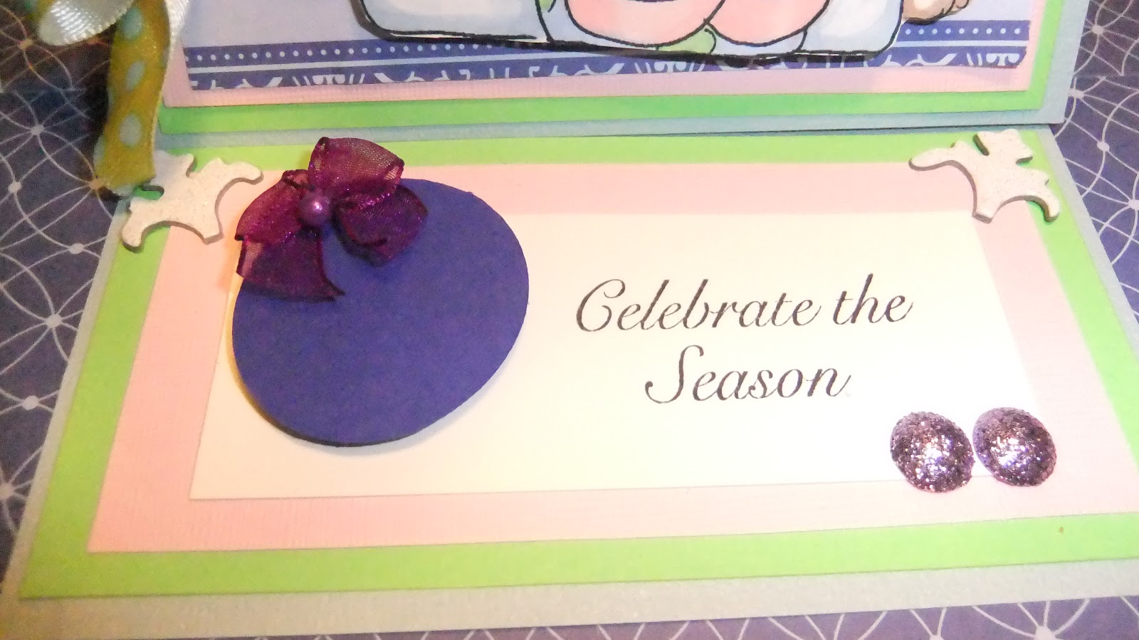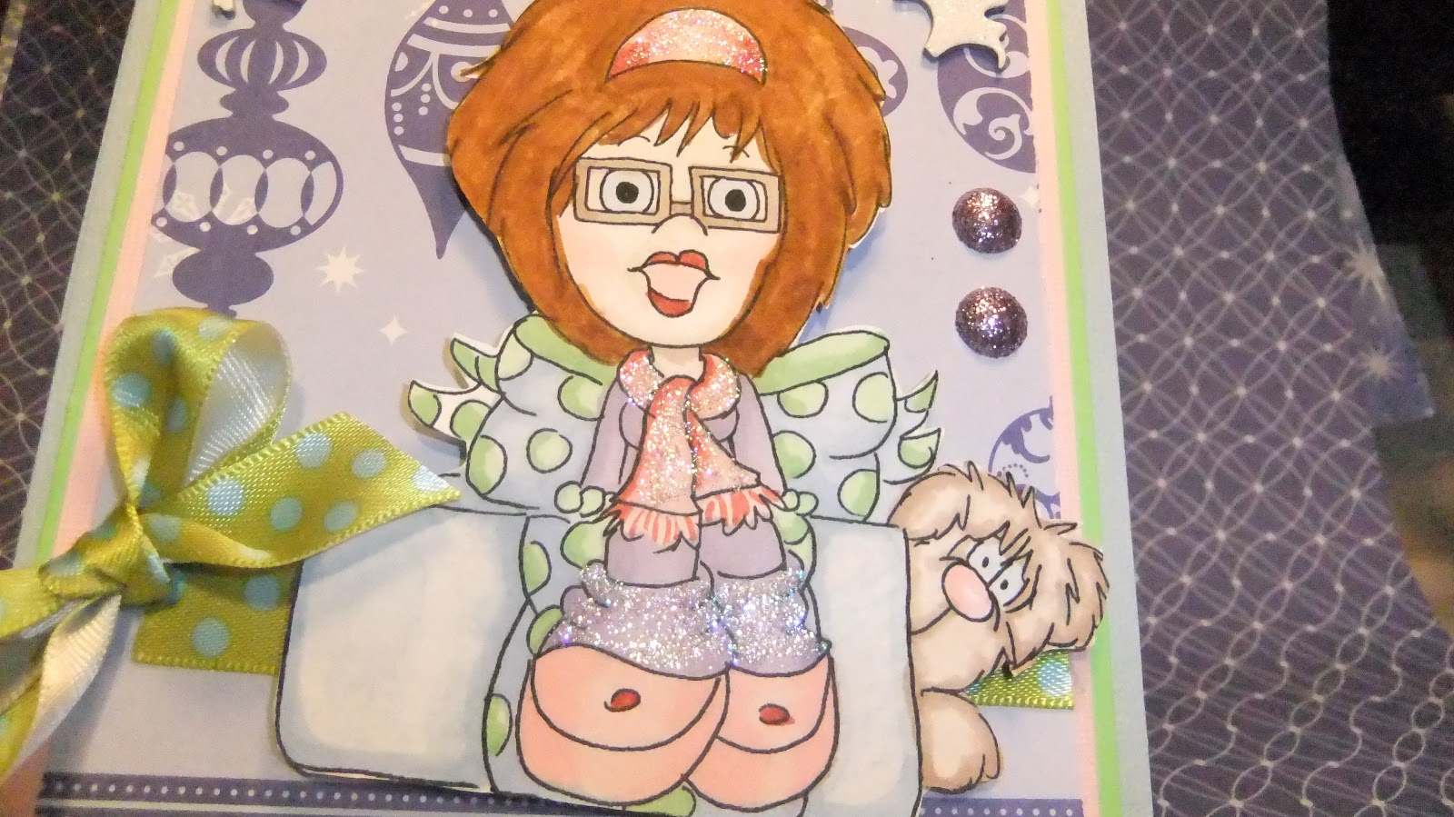For bling, I used some purple  Recollections buttons covered with glitter that I found on clearance at Michaels to give it some dazzle.  For the ribbon, I received today in the mail from fellow crafter Michelle Smith,a pretty green with blue polka dots, which is the opposite of how I colored the bow on the present so it worked out great!  On top of the ornament on the base,I added a pretty purple bow that has a small pearl on it. Then to finish it off...a little Stickles on the headband, scarf and leggings.
