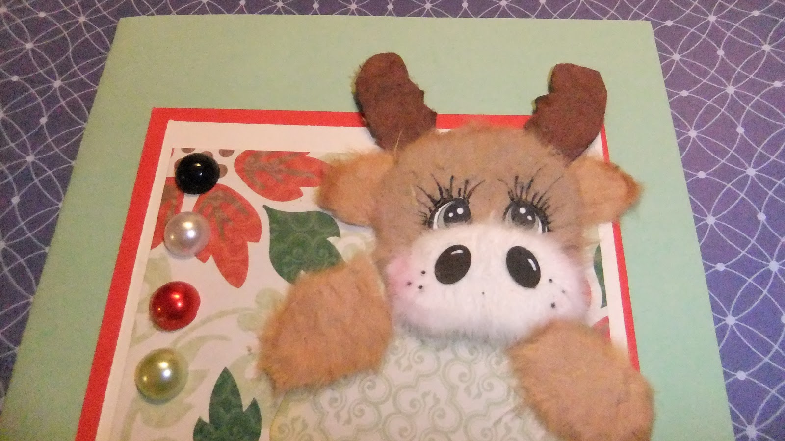 It is a 5 1/2 by 5 and 1/2 card made with the head and paws of a tear critter moose:) Pattern bought from the Beary Scrap.  I added 2  red bows that were given as a gift, so I do not know where they came from , but they have little pearls on them and I thought they were adorable for the little gal. I used a banner chipboard from Closed to My heart and card stock from Core'dinations and inks from CTMH  with rub ons from my stash that I got from a fellow blogger.