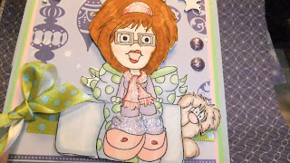 I used Letraset Promarkers to color her in,  and then i cut her out so I could add her to the card after with 3 dimensional pop dots/  I used a light blue base from Michael's Recollections card stock,  finished card size is 5 and 1/2 by 5 and 1//2.  the next mat was bright green at 5 and 1/4 by 5 and 1/4. and then pink at 5 by5.  I used Christmas patterend paper with ornaments in the background. and so I used Cricut Artiste cartridge ornament cut at 2 inches to add on the base with a dimensional to help hold the card up.